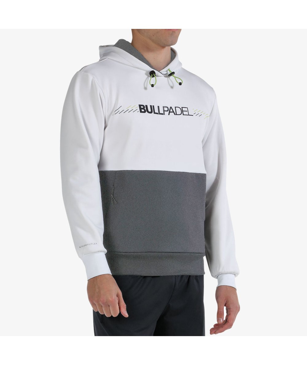 Hooded sweatshirt, chest graphic and kangaroo pocket with sealed zippers. With contrast in the lower part of the garment, it is made of thermal-flex fabric quilted inside.